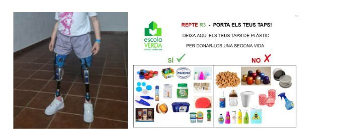 Des del curs 23/24 es recullen els taps de plàstic de diferents residus per reciclar-los, tot col·laborant amb entitats benèfiques. Els 320 kg de taps recollits fins ara s’han destinat a la Fundació SEUR, una entitat sense ànim de lucre que es dedica a ajudar a col·lectius desfavorits, amb especial atenció a la infància. En aquest cas, han servit per ajudar a l’Àngela, finançant les seves pròtesis.