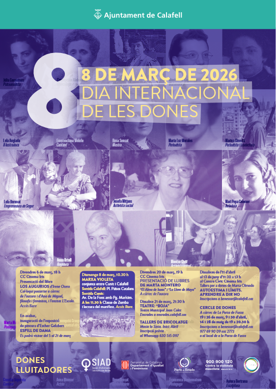 El 8 de març és el dia de la dona, i com tots els anys a Calafell es realitzen activitats. Us compartim la programació que ha publicat l’ajuntament de Calafell.