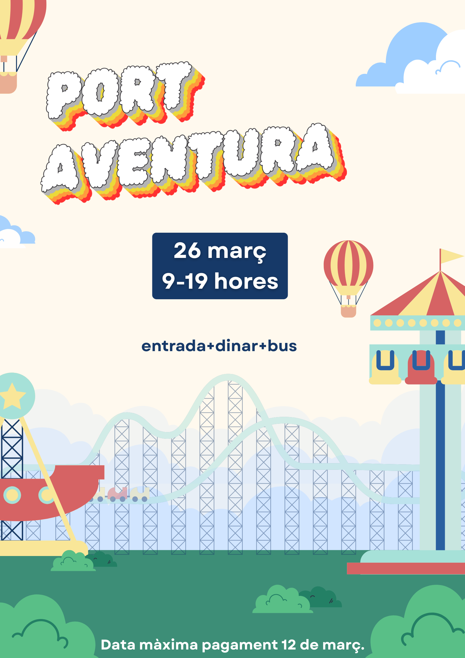 La sortida a Port Aventura serà el 26 de març i té un cost de 53 € (entrada, dinar i bus). El pagament s’ha de fer abans del 12 de març i cal autoritzar la participació de l’alumnat.